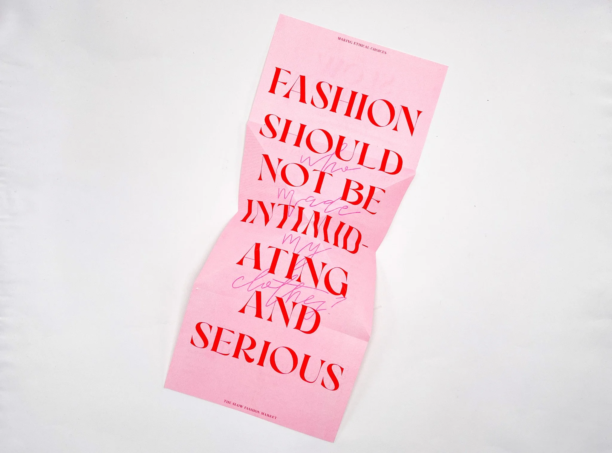 The Slow Fashion Market is a market that allows people to make their own fashion items and sell their products. This university project creates an aesthetic for a flyer/poster that is sophisticated, reflecting the fashion focus of the event. However, an element of fun is still included to draw in a crowd and emphasise the hand-made aspect of the market.